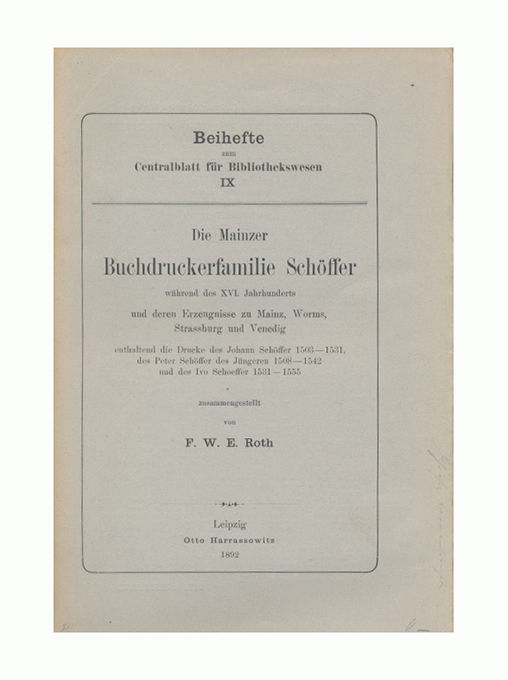 Die Mainzer Buchdruckerfamilie Schöffer während des XVI Jahrhunderts und deren Erzeugnisse zu Mainz Worms Strassburg und Venedig enthaltend die Drucke des Johann Schöffer 1503-1531, des Peter Schöffer des Jüngeren 1508-1542 und des Jvo Schoeffer 1531-1555. Neuntes beiheft zum Zentralblatt für Bibliothekswesen.