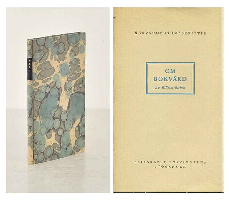 Bokvännens småskrifter nr 8. Tryckt i 600 exemplar. Illustrerad. Med en avslutande ordlista över de bokbindartermer som Barkell använder i boken. William Barkell (1887-1980) var verksam vid Bonniers bokbinderi och en av sin tids skickligaste svenska bokbindare.