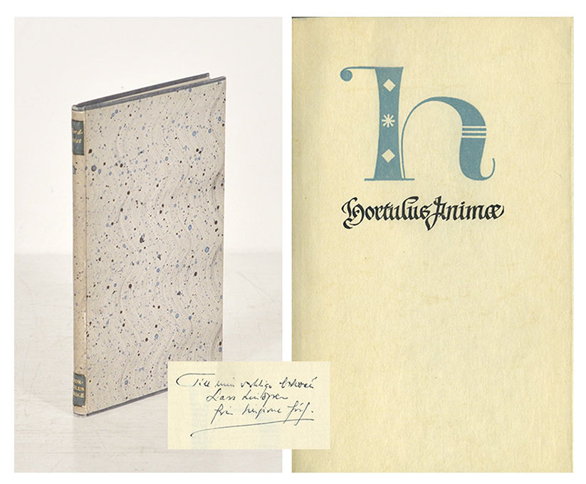 Sthlm, 1960. 53,(2) s. Klotskott marmorerat och stänkdekorerat pappbd med dubbla titeletiketter i blå marokäng (Nils Strömberg, 1961). Omslaget medbundet, liksom det särskilt tryckta gåvokortet, vilket i detta fall är signerat. Ryggen lite nött och gulnad. Med dedikation till Lars A. Lindgren.