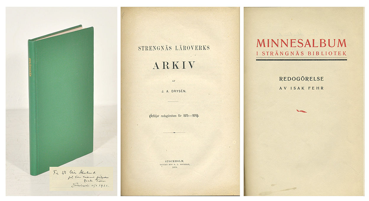 Sthlm, 1876. 128 s. + FEHR, ISAK. Minnesalbum i Strängnäs bibliotek. Redogörelse. (Strängnäs, 1921). 53,(1 blank,1) s. Med inklistrade plr i texten. Grönt enkelt klbd med den förgyllda ryggtiteln ”Strängnäs”. Främre omslaget till andra verket (med dedikation till Nils Ahnlund) medbundet. Handskriven innehållsförteckning på försättsbladet. Ur Magnus von Platens bibliotek.