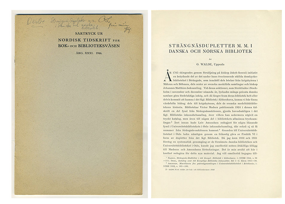 Strängnäsdupletter m.m. i danska och norska bibliotek. Särtryck ur Nordisk tidskrift för bok- och biblioteksväsen, årg. XXXI. 1944.