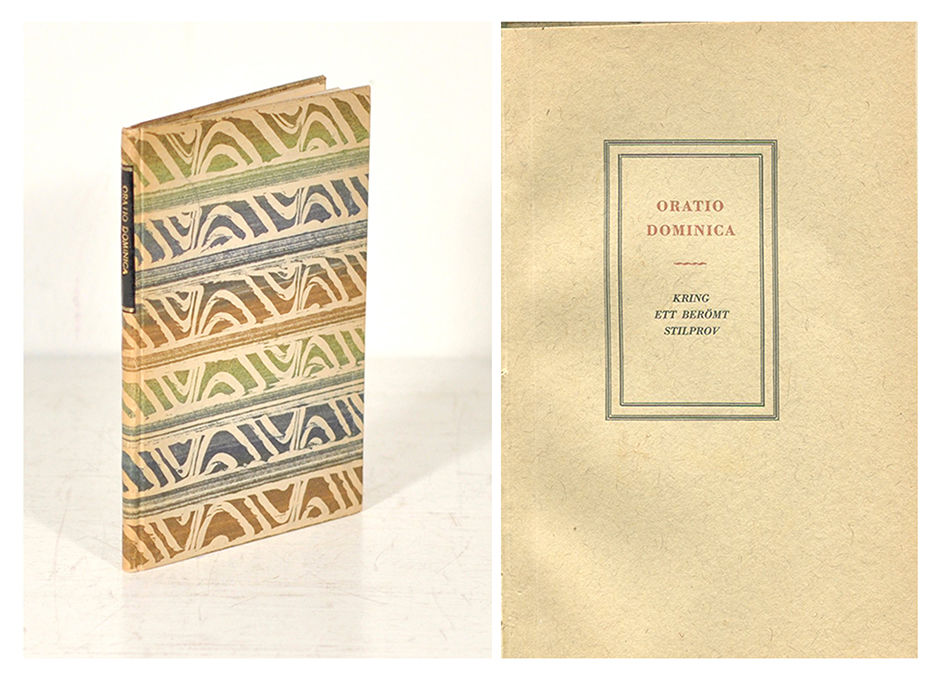 Tryckt i 500 numrerade exemplar, varav detta är nummer 446. Om Bodonis berömda stilprov ”Oratio dominica” där han gav storartat prov på sin förmåga till typografisk gestaltning och samtidigt visade upp sitt enorma stilförråd. Verket avtrycker bönen fader vår på 155 olika språk och dialekter med bland annat en uppsjö av olika exotiska typsnitt. Svenska, gammalt dalmål och samiska tillhör de avtryckta versionerna av bönen.