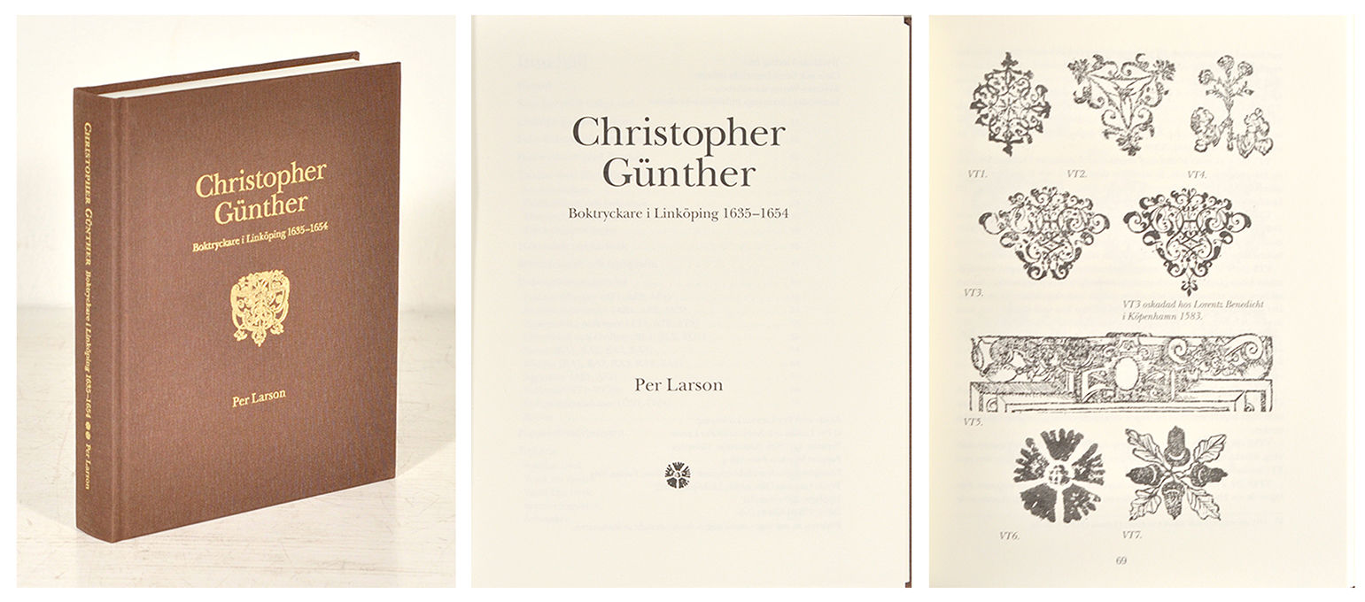 Tryckt i 200 exemplar. Boktryckaren Christopher Günther var verksam i Kalmar 1626-35 och sedan i Linköping 1636-54 som båda städernas första boktryckare. Med en utförlig dokumentation av Günthers typografi, stil- och dekorationsmaterial samt en kronologisk bibliografi över alla kända tryck från Günthers Linköpingstid. Avslutningsvis en alfabetisk förteckning över Linköpingstrycken.