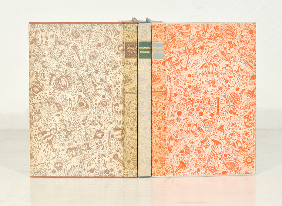 Sthlm, 1956-64. 203,(1) + 191,(1) + 178,(1) s. Tre lätt nötta dekorerade opappbd med klotskodda över- och nederkanter med ljusgrått, grönt respektive mörkgrått övre snitt. Obetydligt nötta med aningen blekta ryggar. En etikett lite mer nött.