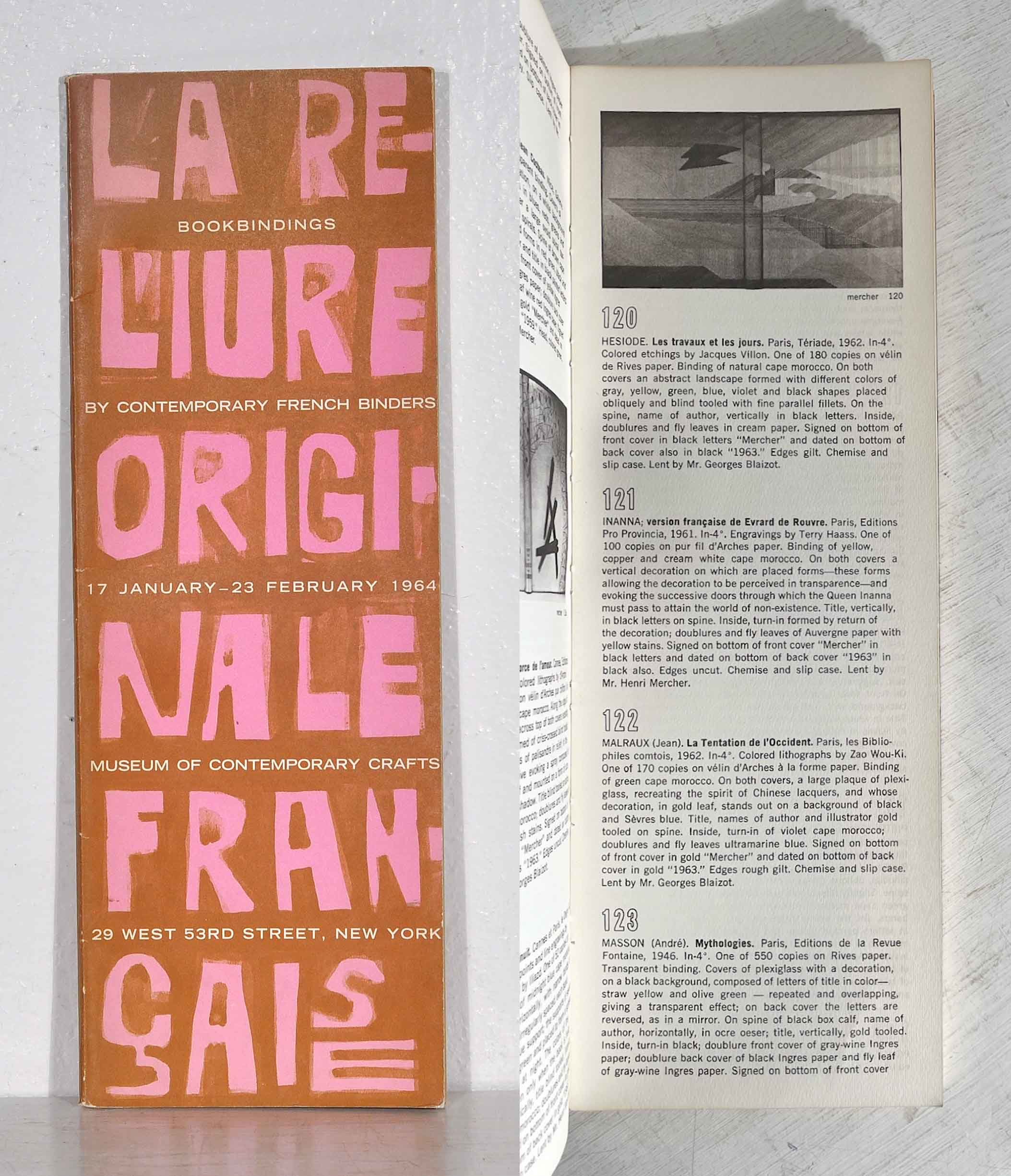 La reliure originale française. Bookbindings by contemporary French binders with a selection of illustrations and examples of typography. Organized under the patronage of the Société de la reliure originale. Museum of contemporary crafts, 29 west 53rd street, New York. 17 January – 23 February 1964.