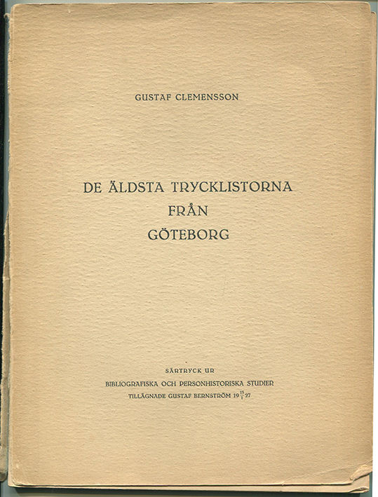 De äldsta trycklistorna från Göteborg. Särtryck ur Bibliografiska och personhistoriska studier tillägnade Gustaf Bernström 15/1 1927.