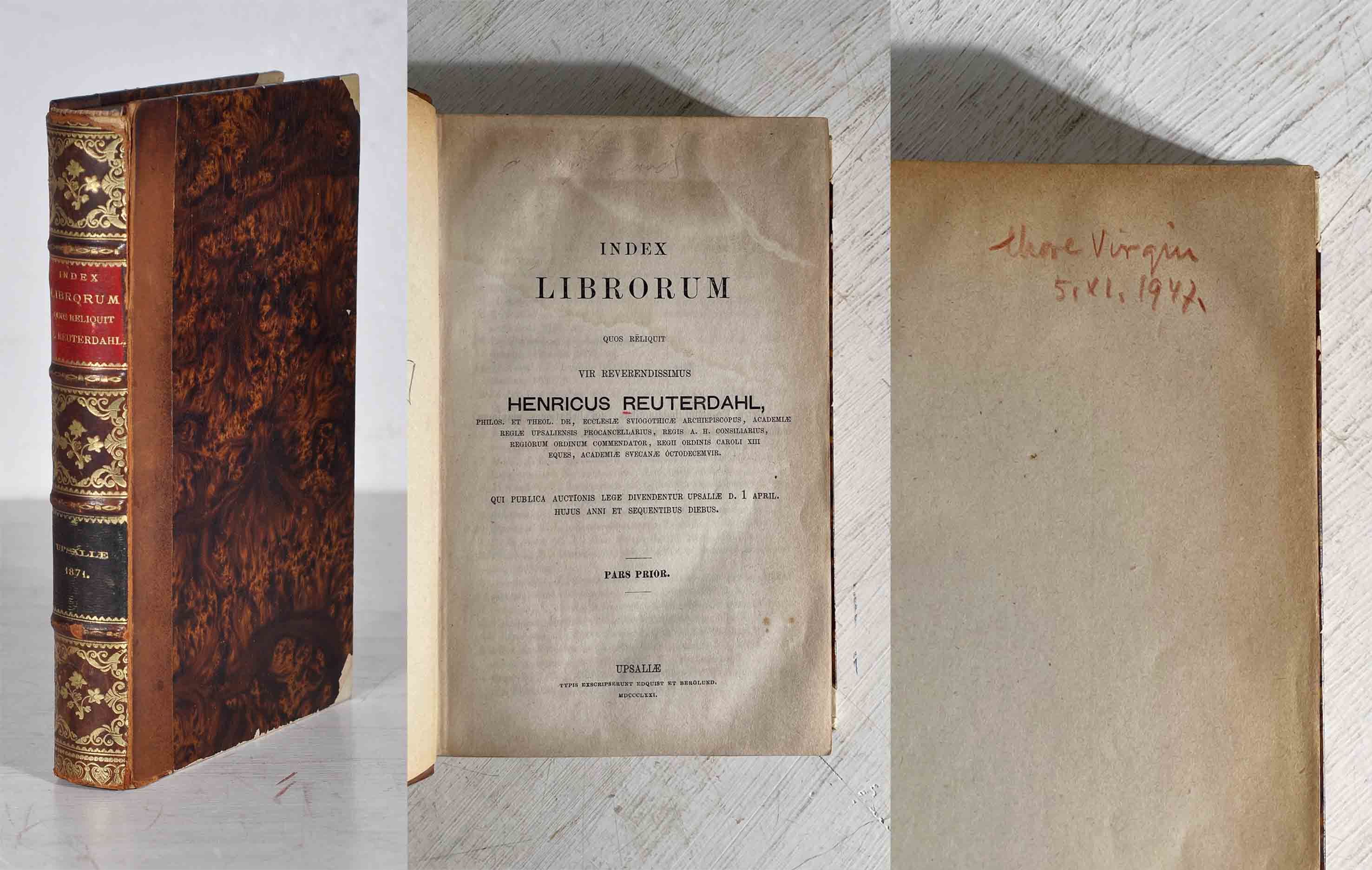 Almquist Sveriges bibliografiska litteratur 4646. Det ovanliga supplementet saknas i detta exemplar. Henrik Reuterdahl (1795-1870) var son till en perukmakare i Malmö och blev tidigt föräldralös. Mecenater ur Malmös högre kretsar bekostade hans skolgång och sedermera disputerade han i grekiska för Esaias Tegnér. 22 år gammal utnämndes han till docent vid teologiska seminariet i Lund och blev efterhand en portalgestalt inom modern svensk kyrkohistorisk forskning. Han slutade sina dagar som ärkebiskop. Boksamlingen innehöll många fina böcker, inte minst inom teologin. Virgin har bland annat markerat Reuterdahls många svenska 1500-talstryck.