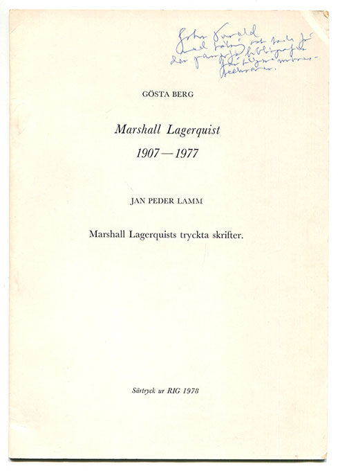 Sthlm, 1977. s. 15-16. + LAMM, JAN PEDER. Marshall Lagerquists tryckta skrifter. Särtryck ur RIG 1978. Sthlm, 1977. s. 17-24. Klammerhäftad med ett något nött omslag. Yttre hörnen stukade. Dedikation till John Tuneld på främre omslag.