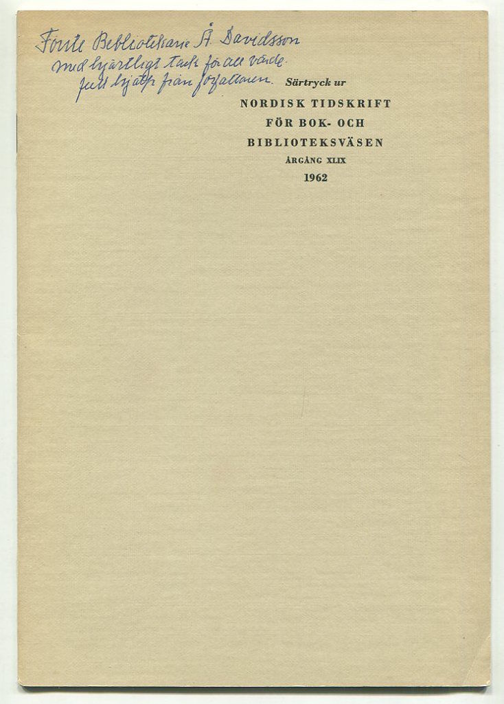 Uppsala, 1962. 16 s. & 1 plansch. Klammerhäftad. Omslaget lätt nött. Med en del korrekturrättelser. Dedikation till Åke Davidsson.