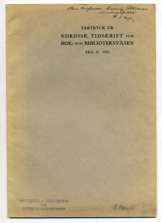 Uppsala, 1915. s. 81-104. Häftad. Omslaget lite nött och småsolkigt samt delvis aningen blekt. Främre omslag med dedikation till Ludvig Stavenow och stpl från Historiska institutionen vid Uppsala universitet.