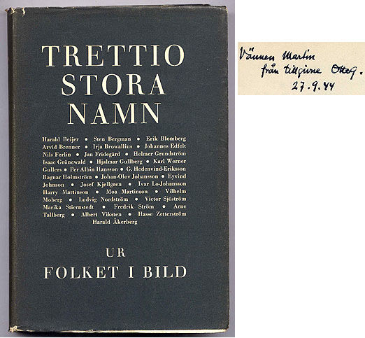 Stockholm, Ab. Katalog- o. tidskriftstryck, 1944. 314,(5) s. & plr. Häftad. Några småfläckar på omslaget. Ryggen missfärgad och lite lös. Liten fläck på övre snittet. Med skyddsomslag i gott skick. Dedikation till ”vännen Martin från Otto G.”