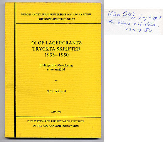 Åbo, Stiftelsens för Åbo akademi offset och kopieringscentral, 1977. 125,(3) s. Häftad. Med dedikation till Olof Lagercrantz.