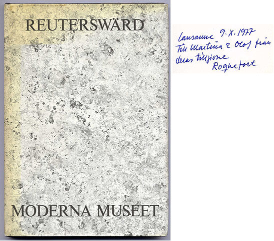 Bern, Benteli, 1977. 90,(2) s. + LINDE, ULF. Kilroy, Castor och Pollux. Carl Fredrik Reuterswärd. Moderna Museet, Stockholm, 10. sep. 1977. Bilaga till Moderna Museets katalog 149. [=rubrik på s. 3]. U.o., (1977). (4) s. Lätt nött opappbd med lätt nött och ojämnt blekt skyddsomslag. Bilagan vikt och löst bilagd. Med dedikation från Reuterswärd i katalogen ”Lausanne 9.X.1977. Till Martina och Olof från deras tillgivne Roquefort”. Ur Olof Lagercrantz bibliotek och med inklistrad etikett på bakre pärmens insida som anger detta.
