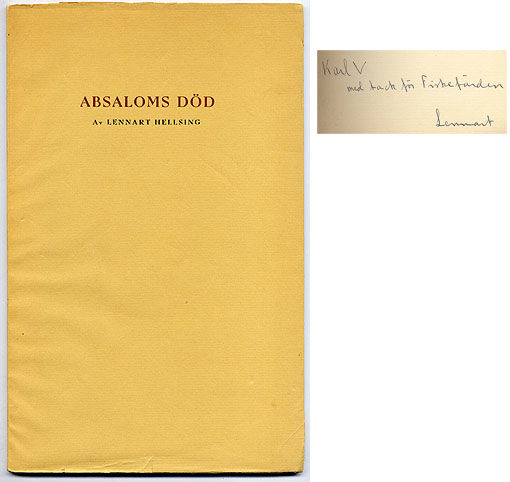 Stockholm, Nordisk rotogravyr, 1949. 33,(2) s. Häftad och lätt nött. Dedikation till Karl Vennberg: ”Karl V / med tack för Fiskefärden / Lennart”.