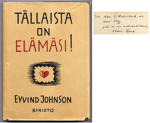 Tavastehus, Karisto, 1939. XVIII,(2),328,(2) s. Oklbd med nött och lite trasigt skyddsomslag. Dedikation till ”Hans G. Westerlund och hans Elly, från en av medvandrarna, vännen Eyvind. Stockholm d. 6.3.40”.