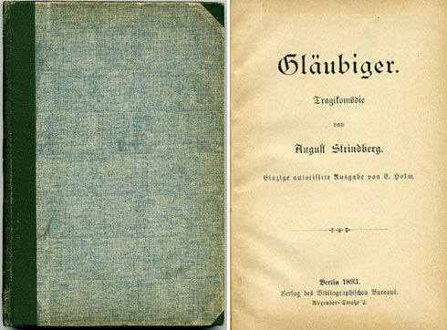 Berlin, Verlag des Bibliographischen Bureaus, 1893. (2),66 s. + STRINDBERG, AUGUST. Debet und Credit. Ein Akt. Berlin, Verlag des Bibliographischen Bureaus, 1893. 30 s. + STRINDBERG, AUGUST. Ein Sommertraum. Ein Akt. Berlin, Verlag des Bibliographischen Bureaus, 1893. 26 s. Nött enkelt samtida hklbd. Victor Léons fula exlibrisstämpel på första deltitelbladet.