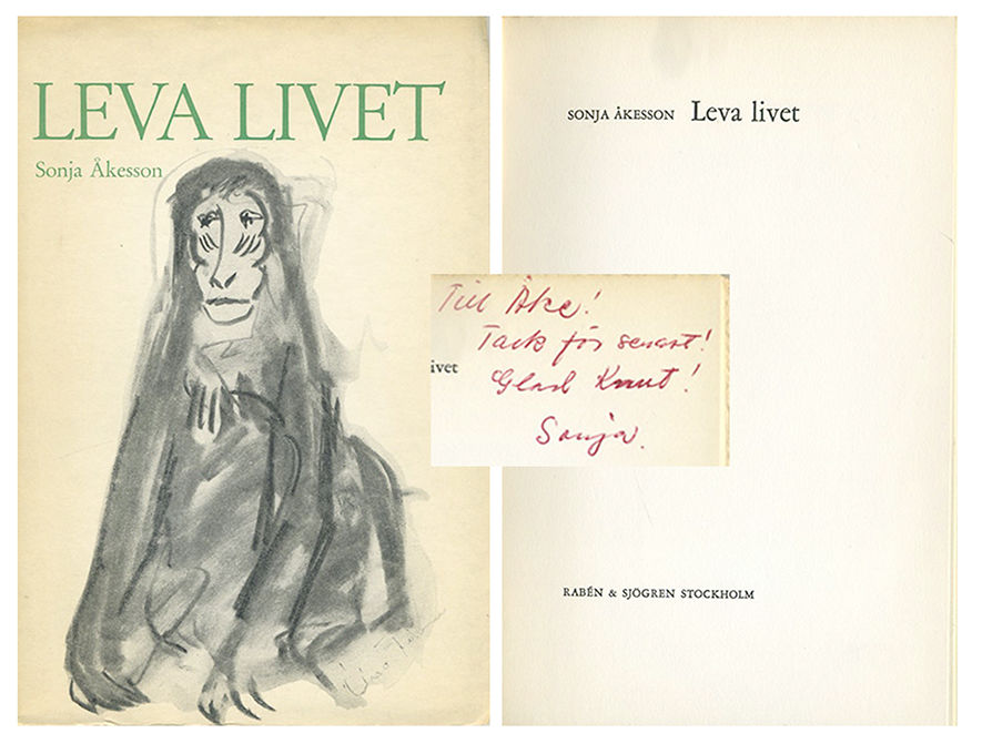 Stockholm, 1961. 52,(1 blank,2) s. Häftad i färgtryckt omslag. Lätt gulnat omslag, mest på ryggen, och med en obetydlig reva upptill i det främre omslaget. Med dedikation: ”Till Åke! Tack för senast! Glad Knut! Sonja”.