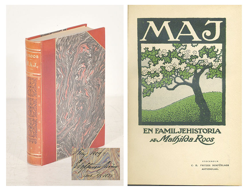 Utgiven av C. E. Fritzes bokförlags aktiebolag. Vackert illustrerat omslag. Titelbladet med den tryckta informationen: ”Prisbelönad vid Iduns stora romanpristäfling år 1905”. Om författaren Mathilda Roos (1852-1908) och föreliggande roman skriver ”Svenskt biografiskt lexikon” bland annat: ” I sina två sista böcker ’Hvit ljung’ (1907) och ’Maj’ (1907) återgick Roos i viss mån till sina åttitalsämnen [...] I familjeromanen ’Maj’ hävdade Roos kravet på äktenskaplig trohet samt föräldrars ansvar och plikt gentemot sina barn”. Allt sedan Selma Lagerlöfs berömda vinst i Iduns romanpristävling 1891 hade den en stor betydelse för att nå ut med nya verk.