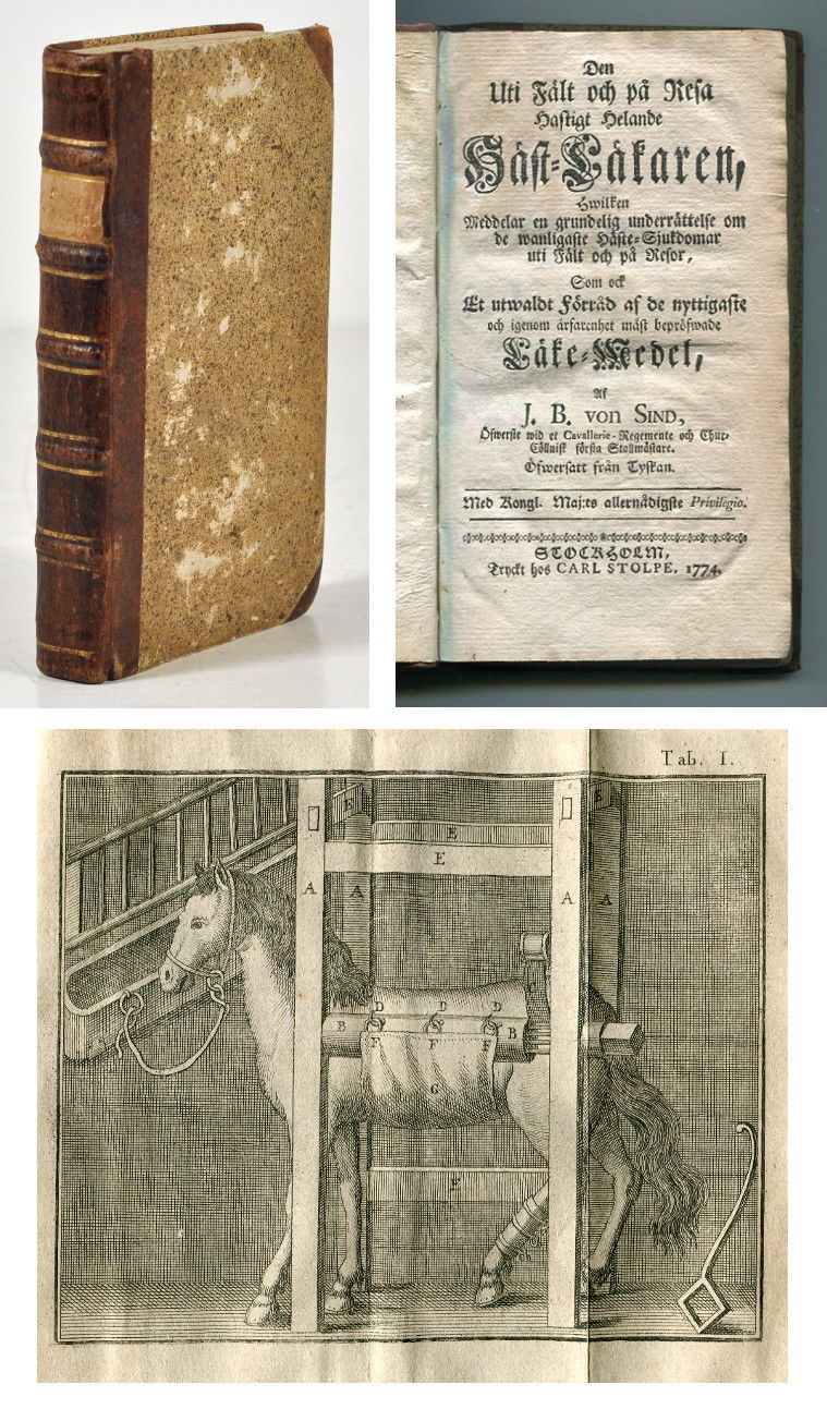 Sthlm, C. Stolpe, 1774. 8:o. (16),240 s. & 1 utvikbar grav. plansch. + SIND, J. B. von. Konsten at utwälja betsel-stänger til alla hästar, efter deras munnars skapnad, som ock at wäl beslå dem; jämte en kort anwisning, huru unga hästar til allmänt bruk, men i synnerhet til krigs-tjensten, skola skickeligen tilöfwas. Utgifwen med kopparstycken. Öfwersatt från tyskan. Sthlm, C. Stolpe, 1774. 8:o. (8),48 s. & 3 utvikbara grav. plr. Samtida ngt nött hfrbd med upphöjda bind, sparsmakad guldornerad rygg och ljus titeletikett i glättad papp med texten: ”Häst-läkaren”. Stänkta snitt. Enstaka fläckar, t.ex. en fuktfläck på s. 1-70 och titelbladet med en svagt bruntonad fläck. Några blad i respektive arbete med en stor fuktrand. Med C. Engelcrantz namnteckning på försättsbladet, daterat 1786.
