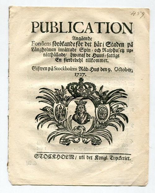 Publication angående fondens förökande för det här i staden på Långholmen inrättade spin- och rasphusetz uprätthållade/ hwaraf de huus-fattige en fierdedehl tillkommer. Gifwen på Stockholms råd-hus den 9 october, 1727.