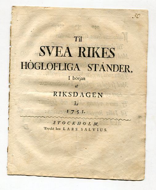 Til Svea rikes höglofliga ständer, i början af riksdagen år 1751.