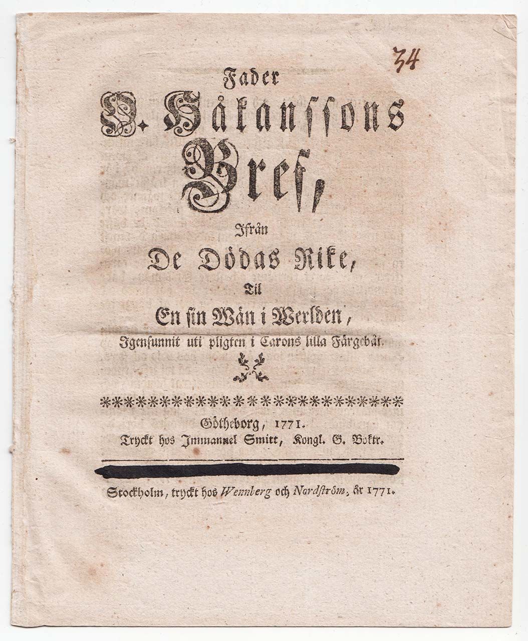 Fader O. Håkanssons bref, ifrån de dödas rike, til en sin wän i werlden, igenfunnit uti pligten i Carons lilla färgebåt. Götheborg, 1771. Tryckt hos Immanuel Smitt, kongl. g. boktr. (Uplagt för andras räkning.)