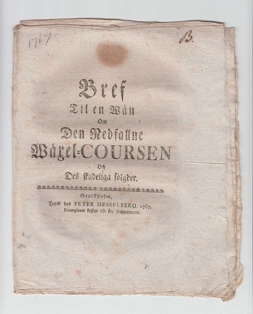 Bref til en wän om den nedfallne wäxel-coursen och des skadeliga fölgder.