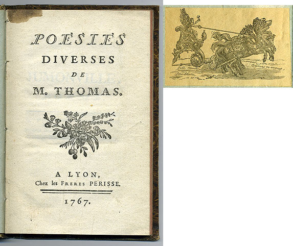 Lyon, chez les freres Perisse, 1767. 12:o. 107 s. Ngt nött pappbd med alrotsmarmorerad rygg, ljusbrun titeletikett och marmorerade pärmpapper. Röda snitt. bläckfläck i övre inre hörnet på titelbladet. Ngt lagerfläckig i början. Med Hammers exlibris.
