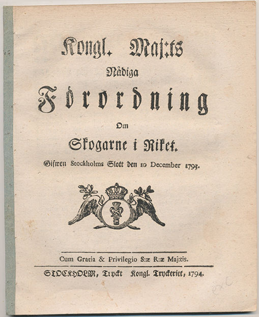 Kongl. maj:ts nådiga förordning om skogarne i riket. Gifwen Stockholms slott den 10 december 1793.