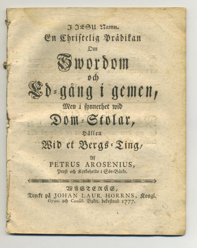 På s. 25 ett nytt titelblad: ”Kort och tydelig underwisning om lagliga och syndiga eder och swordomar, tillika med en allwarlig warning för falska eder och menederi. Ifrån tyskan öfwersatt”. Ett företal till denna text är daterat den 13 april 1725. Arosenius (1718-83) var son till Jöns Andersson Rank, som var klädeshandlare i Västerås. Enligt uppgift blev sonen Petrus Rank tvungen att lägga bort det fäderneärvda släktnamnet av hänsyn till friherrliga ätten Ranck, varefter han antog namnet Westrén efter hemstaden, sedermera latiniserat till Arosenius. Han blev slutligen kontraktsprost och kyrkoherde i Söderbärke och även författare till läroböcker i teologi och hebreiska.