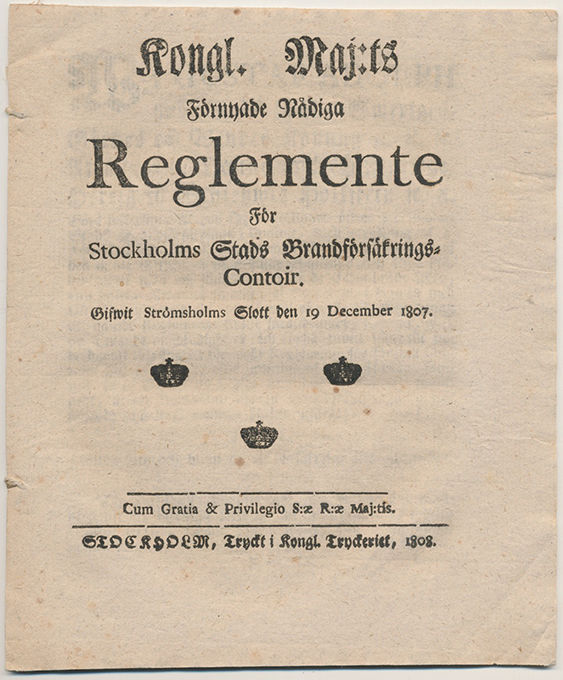 Kongl. maj:ts förnyade nådiga reglemente för Stockholms stads Brandförsäkrings-contoir. Gifwit Strömsholms slott den 19 december 1807.