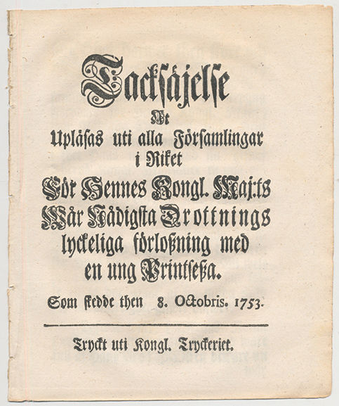 Tacksäjelse at upläsas uti alla församlingar i riket för hennes kongl. maj:ts wår nådigsta drottnings lyckeliga förlossning med en ung printsessa som skedde then 8 octobris 1753.