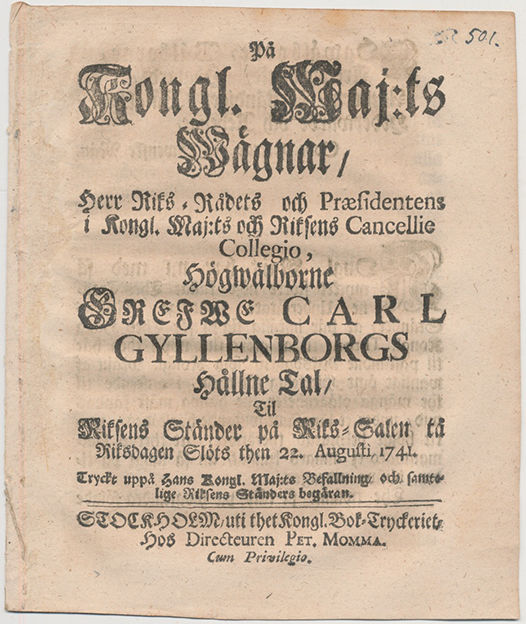 På kongl. maj:ts wägnar/ herr riks-rådets och præsidentens i kongl. maj:ts och riksens Cancellie collegio, högwälborne grefwe Carl Gyllenborgs hållne tal/ til riksens ständer på riks-salen tå riksdagen slöts then 22 augusti 1741. Tryckt uppå hans kongl. maj:ts befallning, och samtelige riksens ständers begäran.