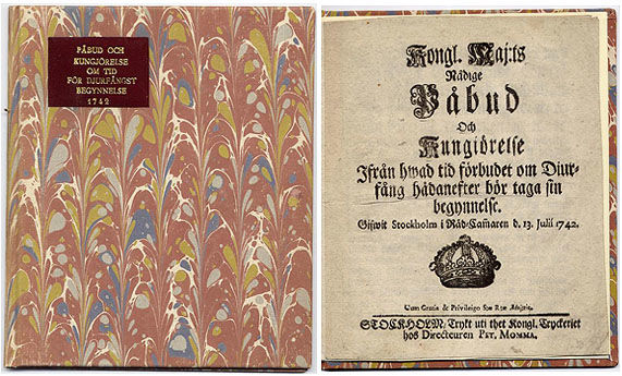 Sthlm, Kongl. tryckeriet, hos P. Momma, (1742). 4:o. (4) s. Fint marmorerat pappbd med vinröd titeletikett i skinn på främre pärmen (Hedberg). På tryckpapper.