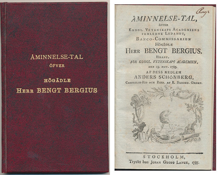 Åminnelse-tal, öfver kongl. Vetenskaps academiens frmledne [sic] ledamot, banco-commissarien högädle herr Bengt Bergius. Hållet för kongl. Vetenskaps academien, den 23 nov. 1785.
