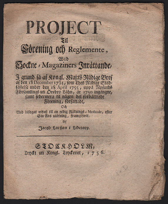Project til förening och reglemente, wid sockne-magaziners inrättande/ i grund så af kongl. maj:ts nådige bref af den 18 december 1734, som thes nådige stadfästelse under den 18 april 1755, uppå Nysunds församlings uti Örebro lähn, år 1750 ingångne, samt sedermera til någon del förbättrade förening, författadt, och med bifogat utkast til en redig räknings-methode, efter siu års utöfning, framgifwit.