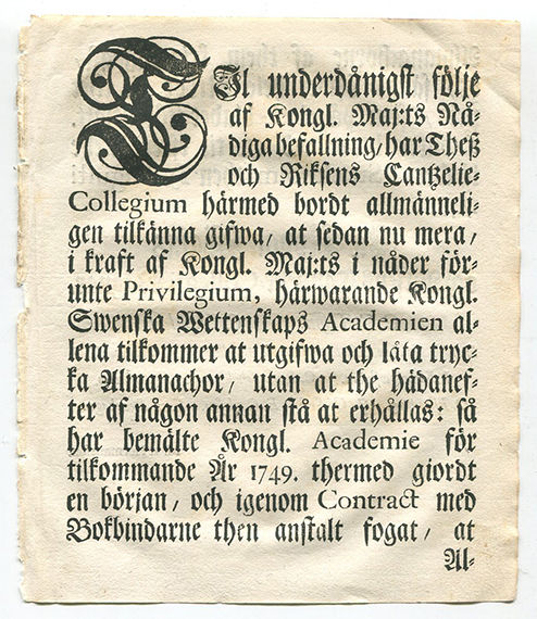 Til underdånigst följe af kongl. maj:ts nådiga befallning, har thess och riksens Cantzelie-collegium härmed bordt allmänneligen tilkänna gifwa, at sedan nu mera, i kraft af kongl. maj:ts i nåder förunte privilegium, härwarande kongl. swenska Wettenskaps academien allena tilkommer at utgifwa och låta trycka almanachor [=inledning].