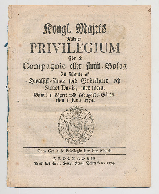 Kongl. maj:ts nådiga privilegium för et compagnie eller slutit bolag til idkande af hwalfisk-fänge wid Grönland och Straet Davis, med mera. Gifwit i lägret wid Ladugårds-gärdet then 1 junii 1774.