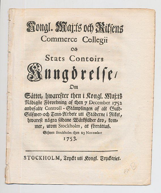 Kongl. maj:ts och riksens Commerce collegii och Stats contoirs kungörelse/ om sättet, hwarefter then i kongl. maj:ts nådigste förordning af then 7 december 1752 anbefalte controll-stämplingen af alt guld- silfwer- och tenn-arbete uti städerne i riket, hwarest några sådane wärkstäder äro, kommer, utom Stockholm, at förrättas. Gifwen Stockholm then 23 november 1753.