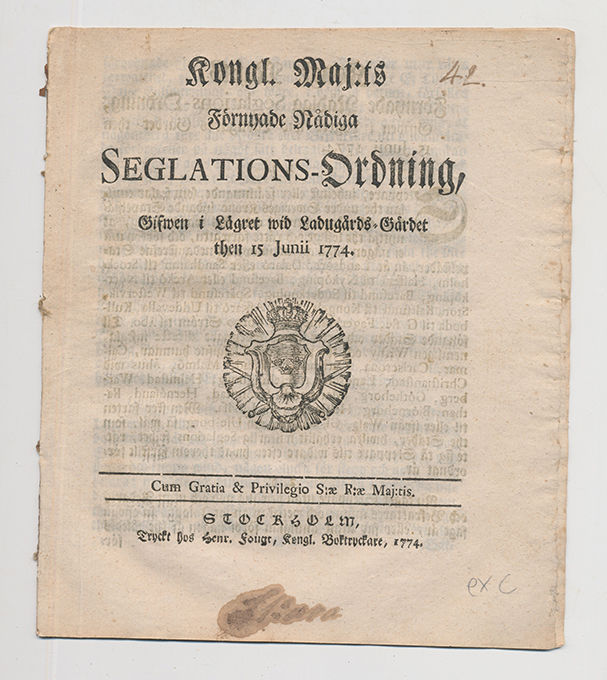 Kongl. maj:ts förnyade nådiga seglations-ordning, gifwen i lägret wid Ladugårds-gärdet then 15 junii 1774.