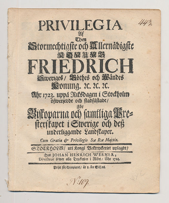 Privilegia af then stormechtigste och allernådigste konung Friedrich Sweriges/ Göthes och Wändes konung &c.&c. &c. åhr 1723 uppå riksdagen i Stockholm öfwersedde och stadfästade/ för biskoparna och samtliga presterskapet i Swerige och dess underliggande landskaper.