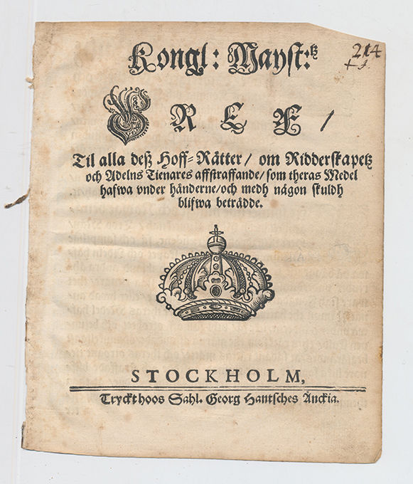 Kongl: mayst:tz bref/ til alla dess hoff-rätter/ om ridderskapetz och adelns tienares affstraffande/ som theras medel hafwa under händerne/ och medh någon skuldh blifwa beträdde.