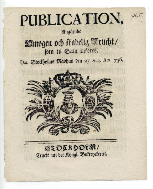 Publication, angående omogen och skadelig frucht, som til salu införes. Dat. Stockholms Rådhus den 27 aug. a:o 1736.