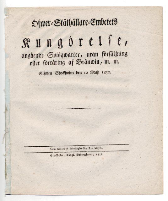 Öfwer-ståthållare-embetets kungörelse, angående spisqwarter, utan försäljning eller förtäring af bränwin, m.m. Gifwen Stockholm den 12 maji 1832.