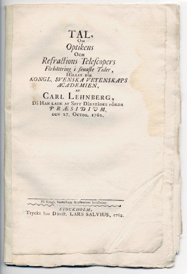 Tal, om optikens och refractions telescopers förbättring i senaste tider, hållit för kongl. svenska Vetenskaps academien, af Carl Lehnberg, då han lade af sitt därstädes förda præsidium, den 27 octob. 1762.