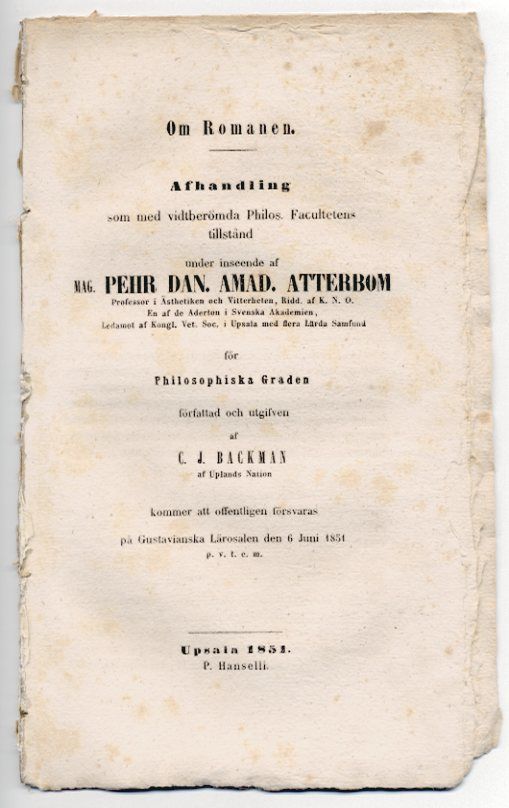 ATTERBOM, PEHR DAN. AMAD. [preses] & BACKMAN, C. J. [författare & respondent].