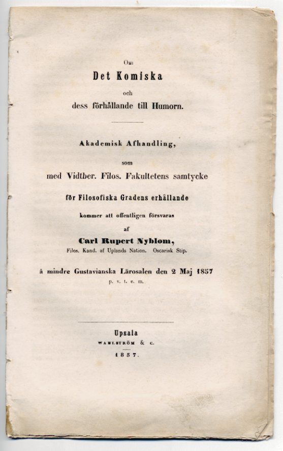 Josephson Avhandlingar ock program s. 170. Carl Rupert Nyblom (1832-1907) var professor i estetik, litteratur- och konsthistoria vid Uppsala universitet från 1867. Han invaldes i Svenska akademien 1879.