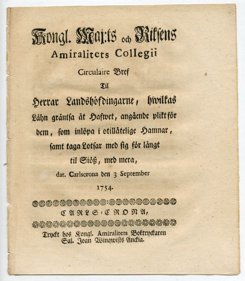 Kongl. maj:ts och riksens Amiralitets collegii circulaire bref til herrar landshöfdingarne, hwilkas lähn gräntsa åt hafwet, angående det wid amiralitetet enrollerade siö-folckets och handtwerckarnes befrielse ifrån utskylder, dat. Carlscrona den 3 september 1754.