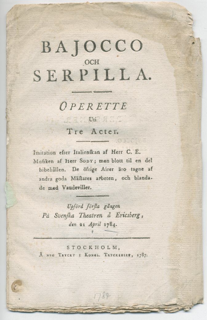 Bajocco och Serpilla. Operette uti tre acter. Imitation efter italienskan af herr C. E. Musiken af herr Sody; men blott til en del bibehållen. De öfrige airer äro tagne af andra goda mästares arbeten, och blandade med vaudeviller. Upförd första gången på Svenska theatren å Ericsberg, den 21 april 1784.