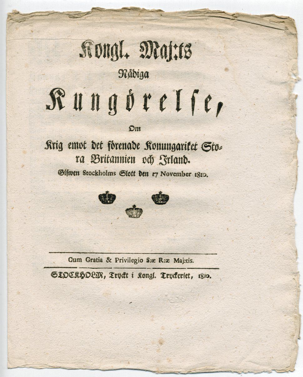 Kongl. maj:ts nådiga kungörelse, om krig emot det förenade konungariket Stora Britannien och Irland. Gifwen Stockholms slott den 17 november 1810.